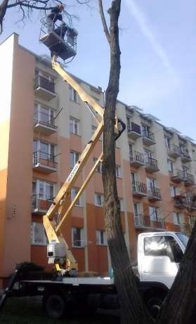 Wycinka drzew trudno dostępnych (rośnących nad liniami energetycznymi, dachami przy ogrodzeniach) z podnośnika koszowego 21 m