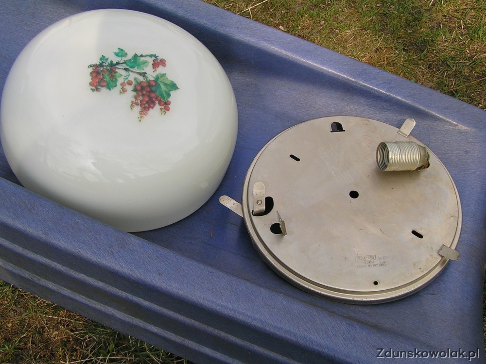 Lampa ze szklanym ,białym kloszem z naklejką. Można zamocować na suficie, ścianie wewnętrznej lub zewnętrznej z nr. posesji.