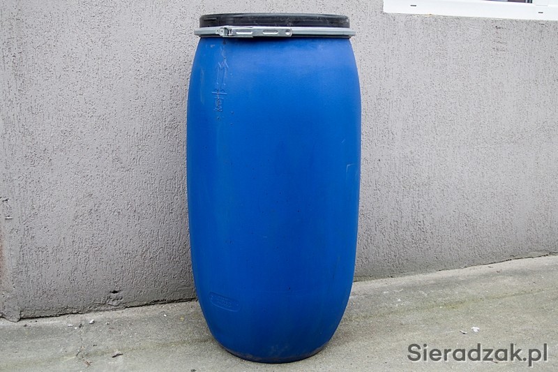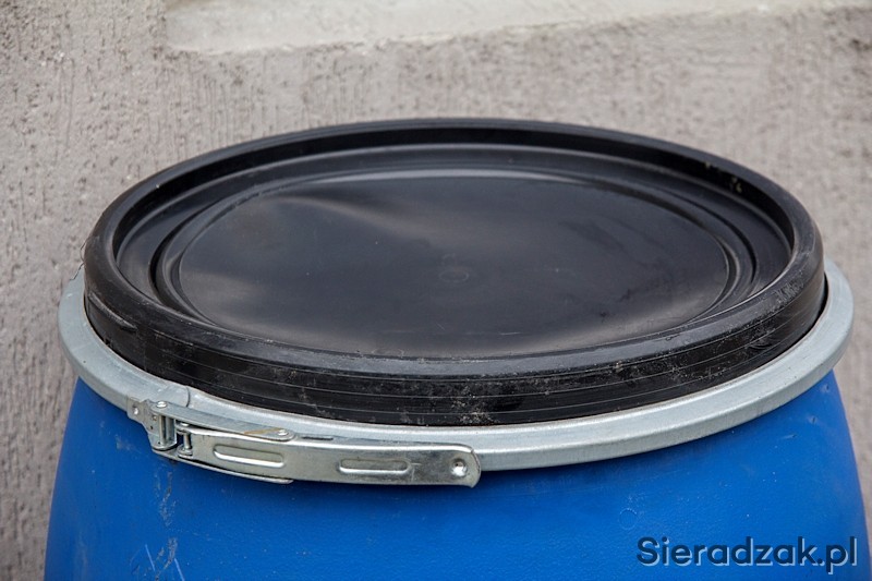 Beczka 150 litrów, plastikowa, z deklem i aluminiową obejmą.