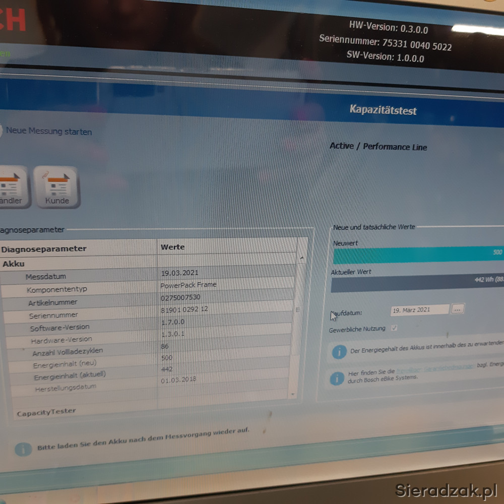 silnik BOSCH 250W,36V,bateria powerpack 500Wh 13.4 Ah,aktualna energia akumulatora 422Wh 88.40%,86 cykli ładowania.przebieg 11.415km.pomimo dużego przebiegu stan baterii bardzo dobry.