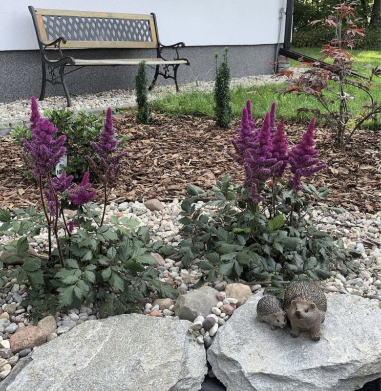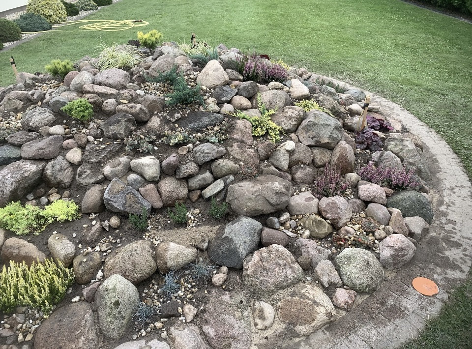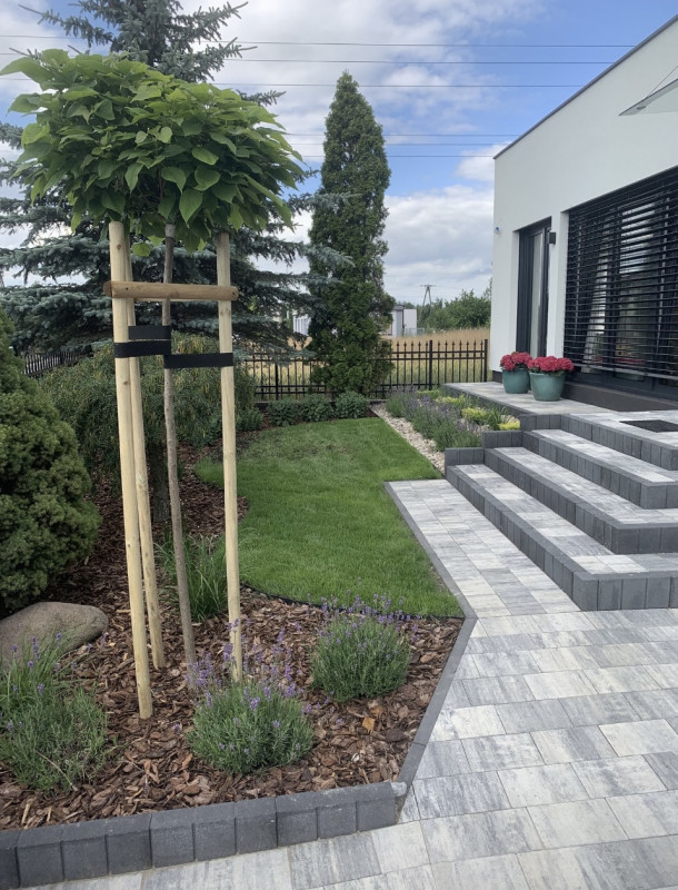 > nasadzeniami roślin, formowaniem rabat i ściółkowaniem korą lub kamieniem itd.