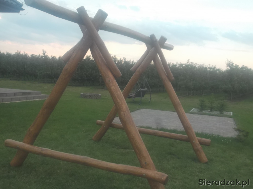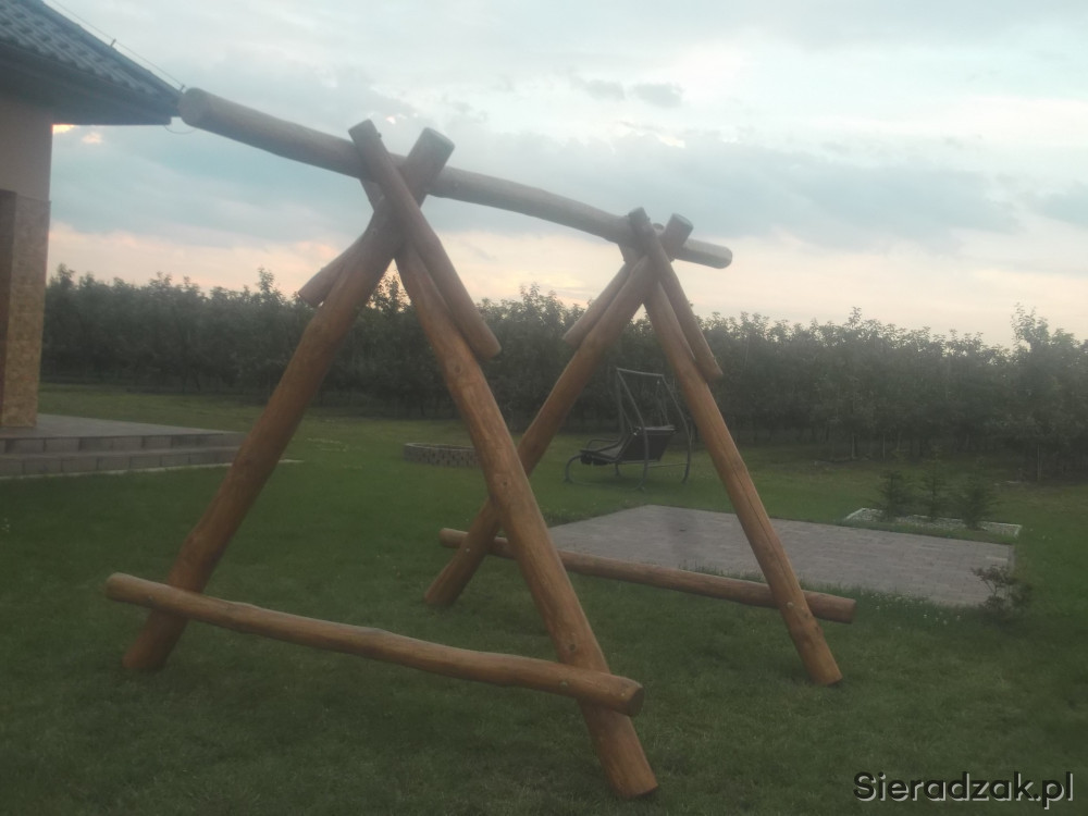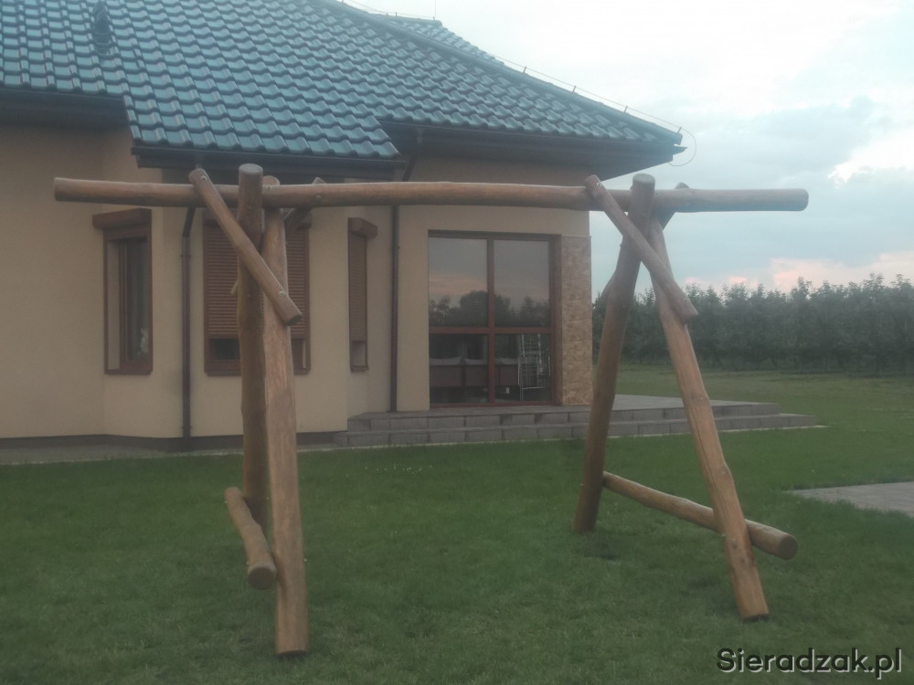 Wita oferuje gotowy stelarz do hustawki dla doroskych + bocianie gniazdo z prawij , mala hustawka dla dzieci z lewej strony. Calosc wykpnana z sezonowanych bali sosnowych oszlifowanych dokladnie i zaimpregnowana preparatem Sadolin-hybrydowy, kolor dowolny zalerzy od gustu klienta. Calosc wykonana mocno i solidnie skrecona srubami M 10.Zapraszm serdecznie