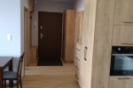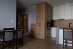Aneks kuchenny wyposażony we wszystkie niezbędne sprzęty AGD (lodówka, płyta indukcyjna, piekarnik, mikrofalówka).