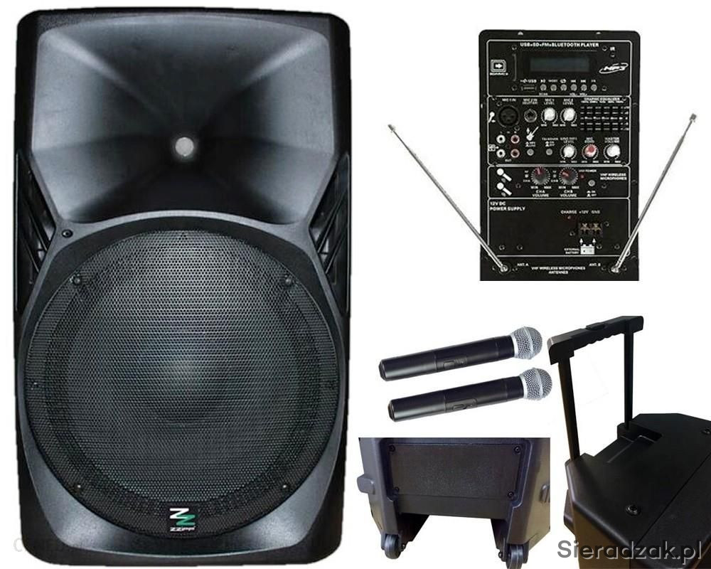 Przenośny system wzmacniający, z wbudowanym odtwarzaczem MP3 (SD i USB), odbiornikiem Bluetooth, tunerem FM oraz dwoma doręcznymi mikrofonami bezprzewodowymi.