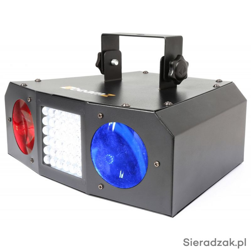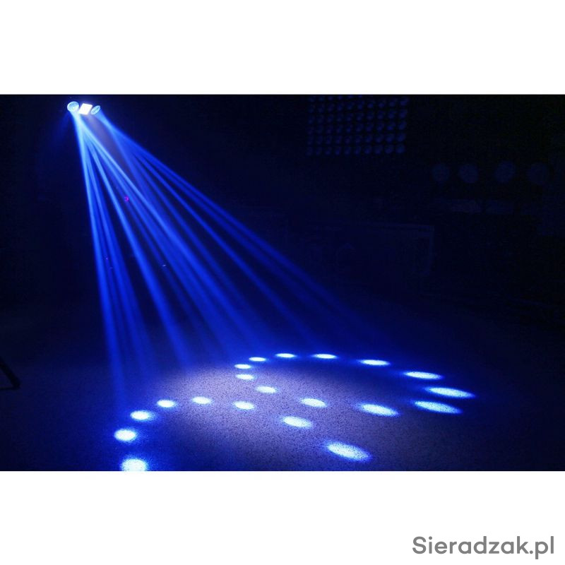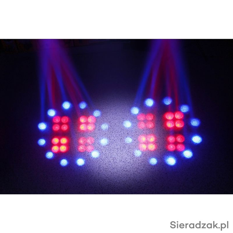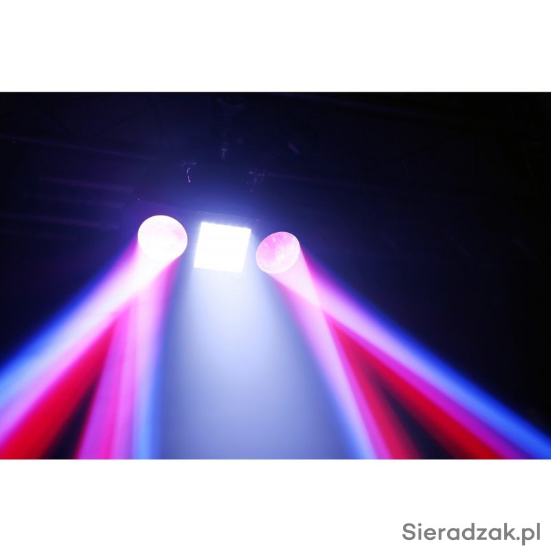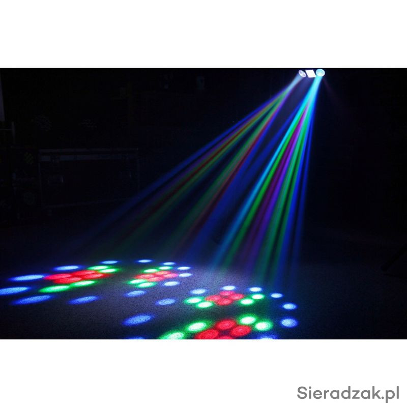 Podwójny efekt LED RGBW. Dzięki mocnym diodom LED i podwójnej soczewce, efekt emituje dwie mocne wiązki światła, które zmieniają się w rytm muzyki lub w trybie auto. W urządzeniu zastosowano również wydajny efekt stroboskopu, który wzmacnia walory wizualne światła. Efekt idealny dla mobilnych DJ-ów i do instalacji w mniejszych lokalach, klubach, dyskotekach. Urządzenie trwałe i bezawaryjne.