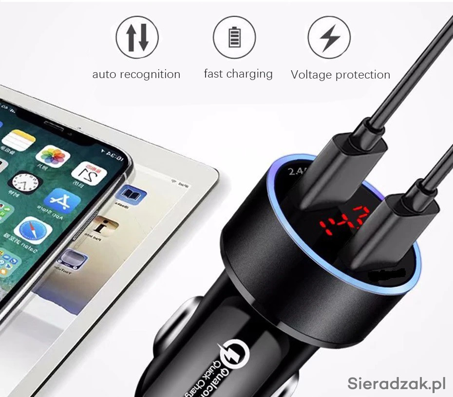 Oferuję do sprzedaży nowe ładowarki do gniazda zapalniczki samochodowej z dwoma portami USB i wyświetlaczem napięcia akumulatora.