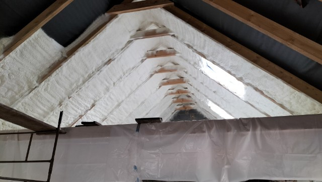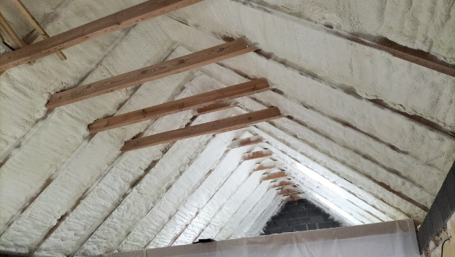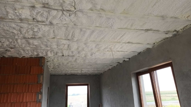 Ocieplanie polega na natrysku piany poliuretanowej (zamkniętokomórkowej lub otwartokomórkowej).