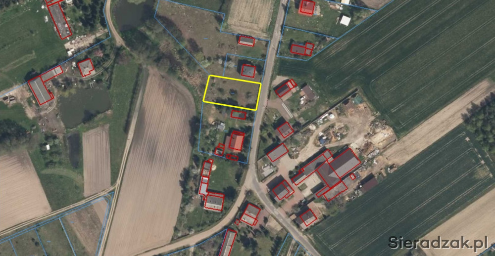 Nieruchomość zlokalizowana po środku wsi, częściowo ogrodzona płotem betonowym oraz siatką