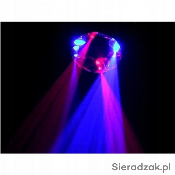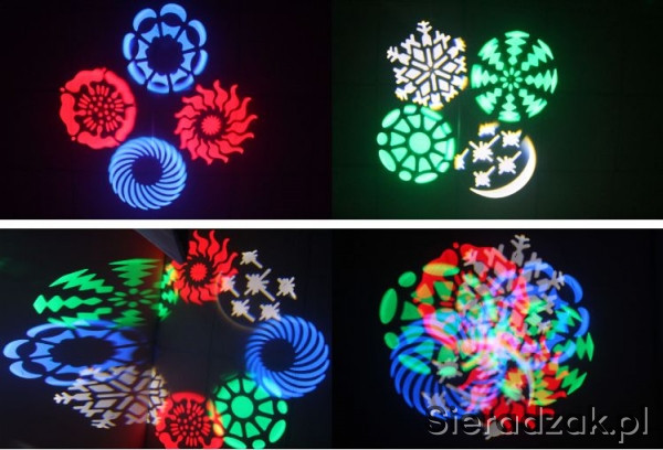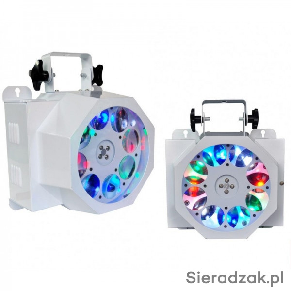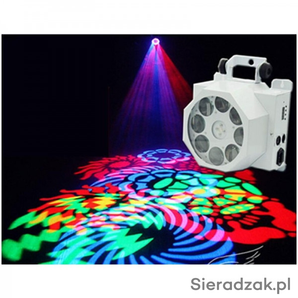 EFEKT SPOT GOBO FLOWER zostało wyposażone w mocne źródło światła 8 x 3W LED CREE RGBW oraz kilkanaście wbudowanych ekscytujących pokazów świetlnych wzorów Gobo. Możliwość sterowania poprzez tryb DMX, master-slave, sterowanie dźwiękiem lub w trybie automatycznym. Na tylnym panelu znajduje się duży cyfrowy wyświetlacz LED oraz 4-przyciski do obsługi menu. Losowy efekt stroboskopowy i pulsacyjny. Obrotowa tarcza.