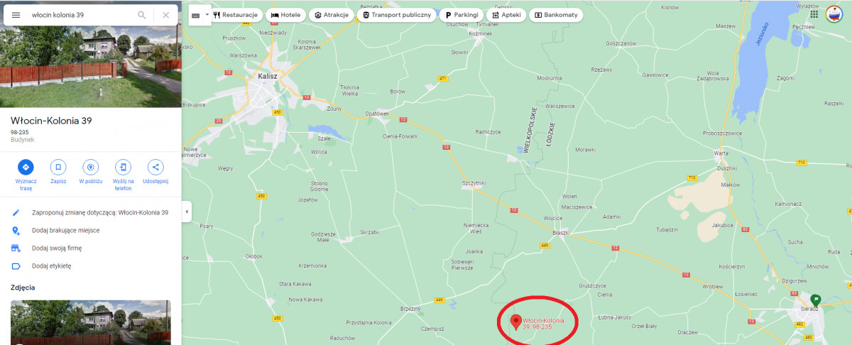 До Серадза (Sieradz) 28 км. До Калиша (Kalisz)30 км. Влоцинская колония (Włocin kolonia). Отмечено на карте.