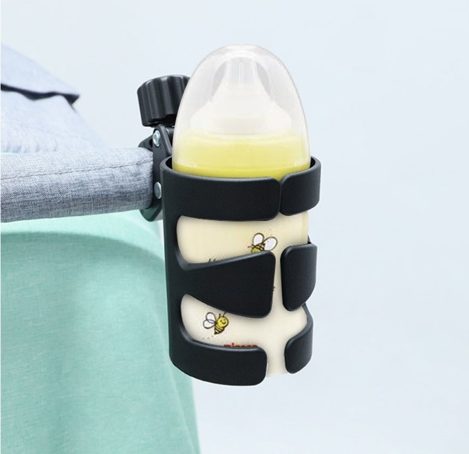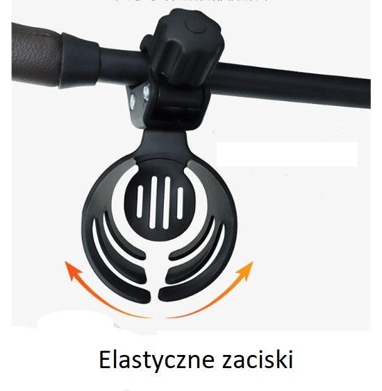 Uchwyt jest sprężysty i samoistnie zaciska się na butelce lub innym włożonym pojemniku.