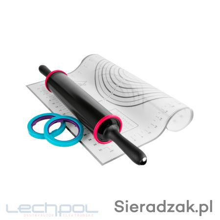 W skład zestawu TSA0174 wchodzi także wałek, którego silikonowa powłoka nie klei się do ciasta, zapewniając tym samym maksymalny komfort w czasie pracy. Dodatkowo wraz z wałkiem silikonowym otrzymujesz 3 pary krążków, których zadaniem jest regulowanie grubości ciasta.