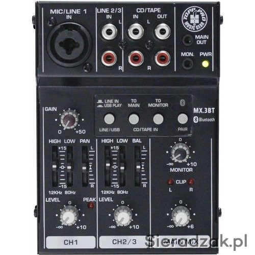 Mikser 3-kanały Bluetooth Interfejs USB Topp Pro TP MX3BT + kabel USB i zasilacz