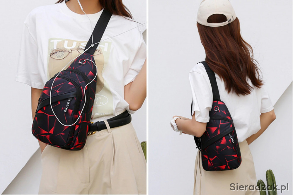 Pasek jest regulowany w szerokim zakresie. Na górze głównej kieszeni znajduje się wyjście na słuchawki.