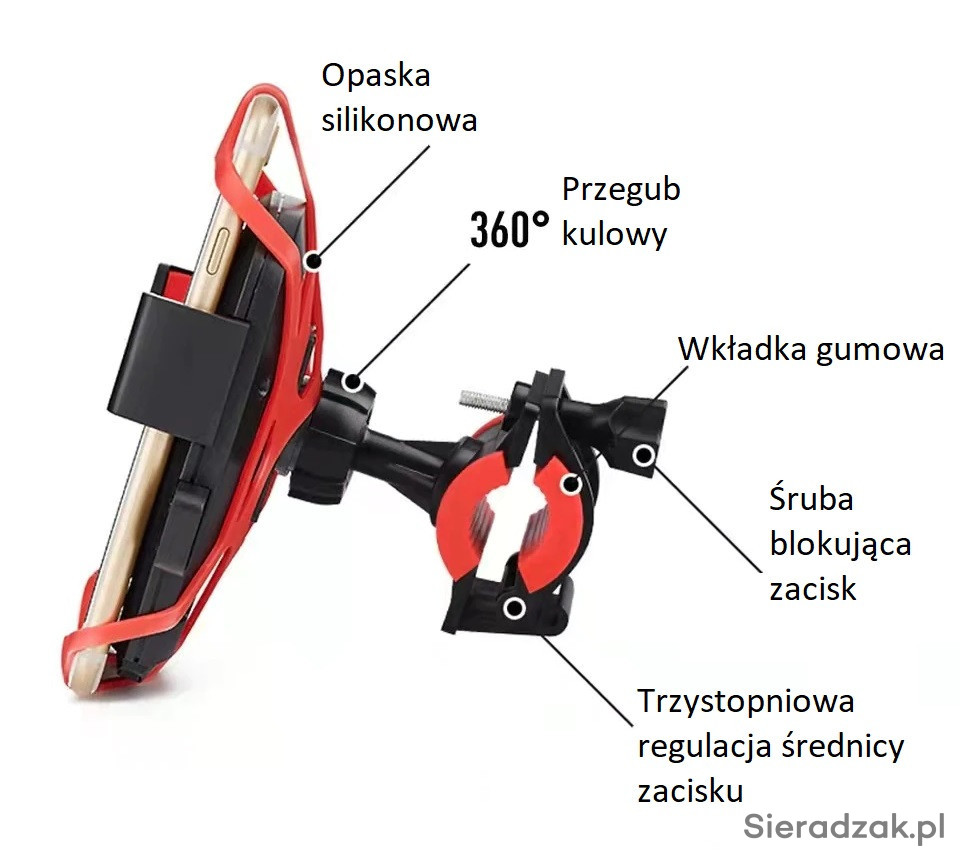 Na "plecach" uchwytu znajduje się silikonowa opaska przytrzymująca telefon.