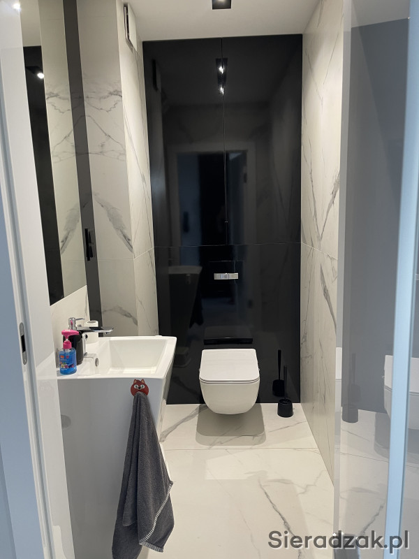 - płytki w łazience, toalecie, korytarzu oraz części kuchennej wyłożone w płytkach dużego formatu Tubądzin pietrasanta.