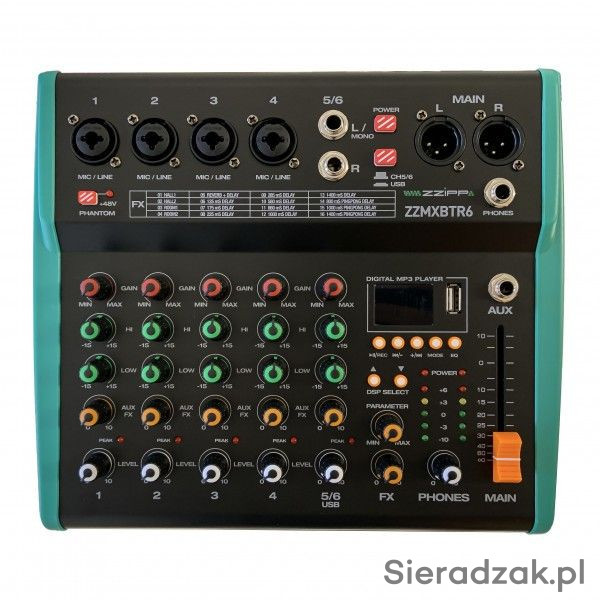 Mikser audio 6-kanałowy, z wbudowanym urządzeniem efektowym DSP oraz odtwarzaczem/rejestratorem MP3 (USB)