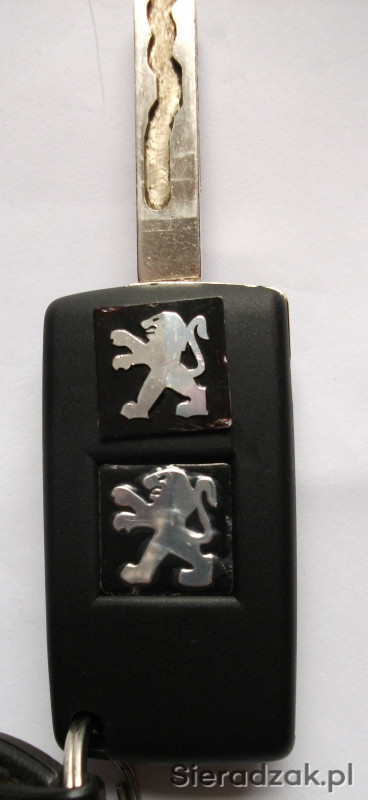 Emblemat Peugeot został zdjęty z obudowy kluczyka. Na fotografii wyraźnie widać różnicę między francuskim oryginałem (u góry) a chińską podróbką.