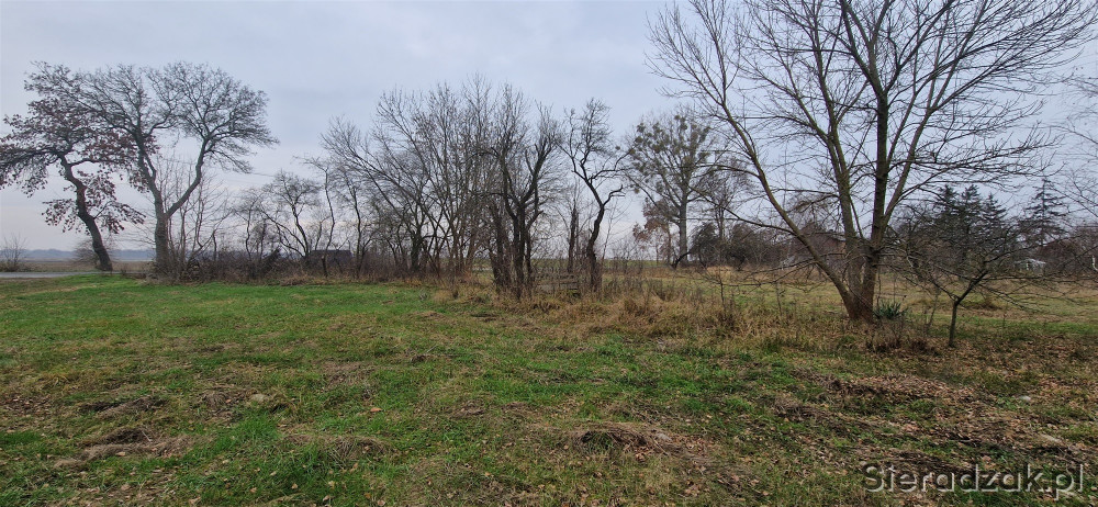 Na działce znajdują się stare drzewa i krzewy ozdobne.