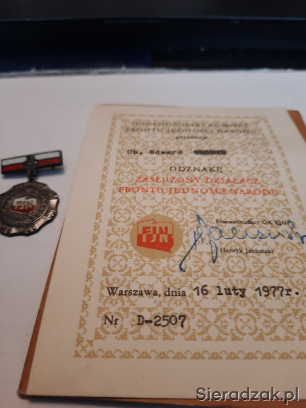 Odznaka - Zasłużony działacz Frontu Jedności Narodu. Legitymacja z 1977r