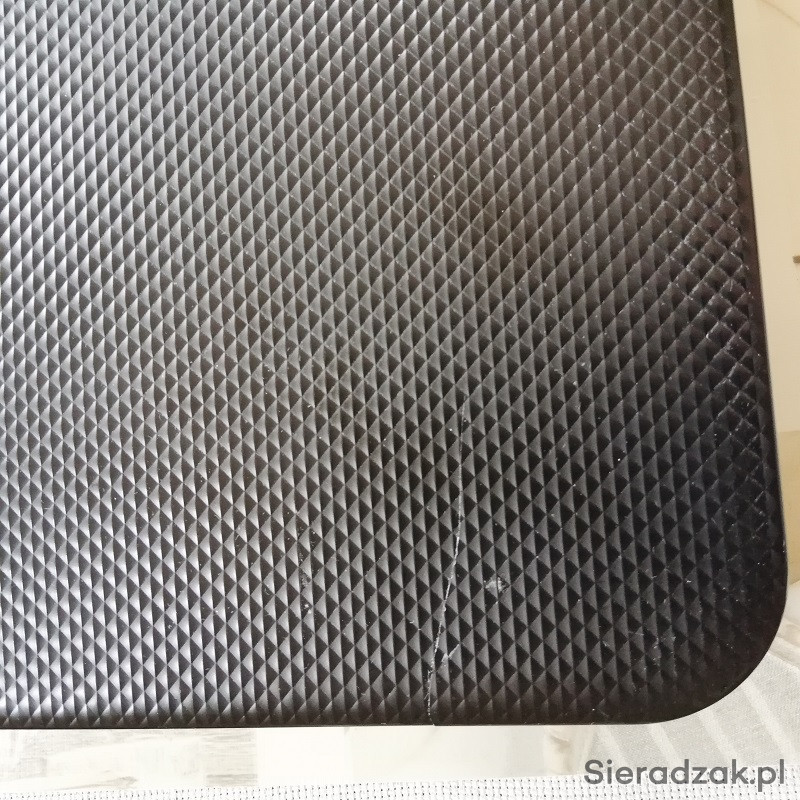 Laptop posiada małe pęknięcie obudowy widoczne na zdjęciu oraz linie na włączonym ekranie ale nie przeszkadza to w pracy.