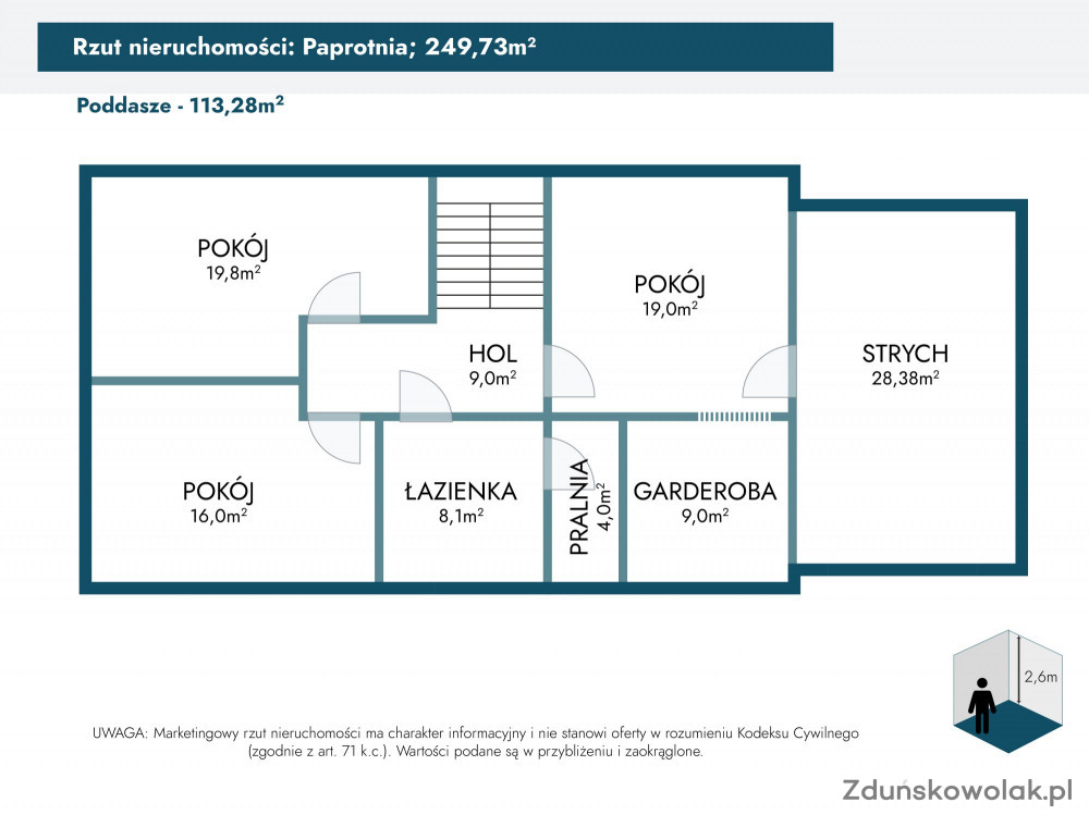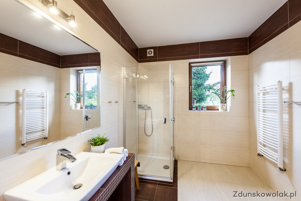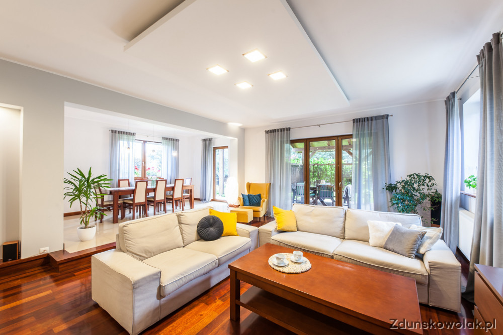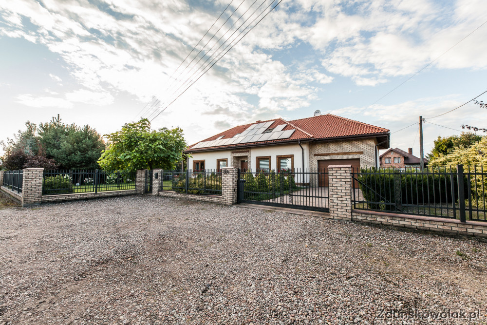 Powierzchnia całkowita domu to 240 mkw. Nieruchomość jest bardzo funkcjonalna i uporządkowana. Każde z pomieszczeń jest wykorzystywane w konkretnych celach. Dopracowane zostały wszelkie drobiazgi. W holu oraz sypialni wygospodarowano oddzielną przestrzeń na garderobę zamykaną na drzwi przesuwne z lustrem. Duża kuchnia, a obok niej spiżarnia pozwalająca pomieścić dodatkowe artykuły spożywcze. Salon połączony z jadalnią przenikają się wzajemnie dając przestronność i komfort. Wiele okien daję dostęp do długiego widocznego dziennego światła, a wieczorami dobrze rozjaśnia zamontowane oświetlenie. Dwie łazienki, na dole z prysznicem, a na górze z wanną, z której przechodzi się do pralni. Sypiania z dostępem do strychu i dwa oddzielne pokoje z przeznaczeniem na pokój dla dziecka, gości jak i biuro, np. pod prace w trybie zdalnym lub działalność gospodarczą.