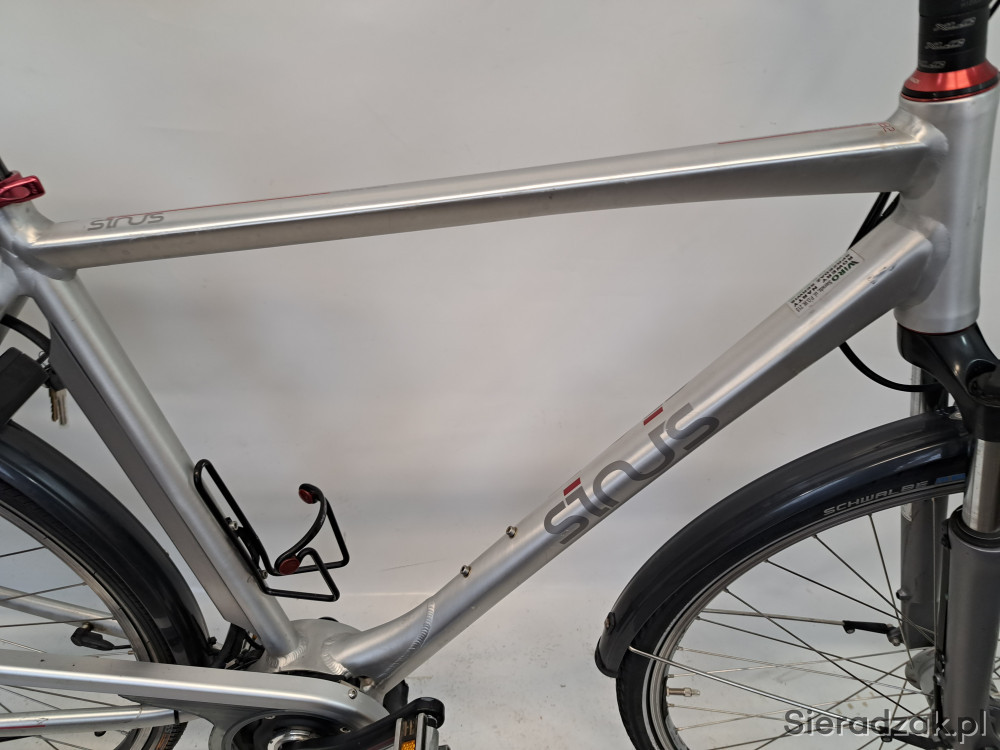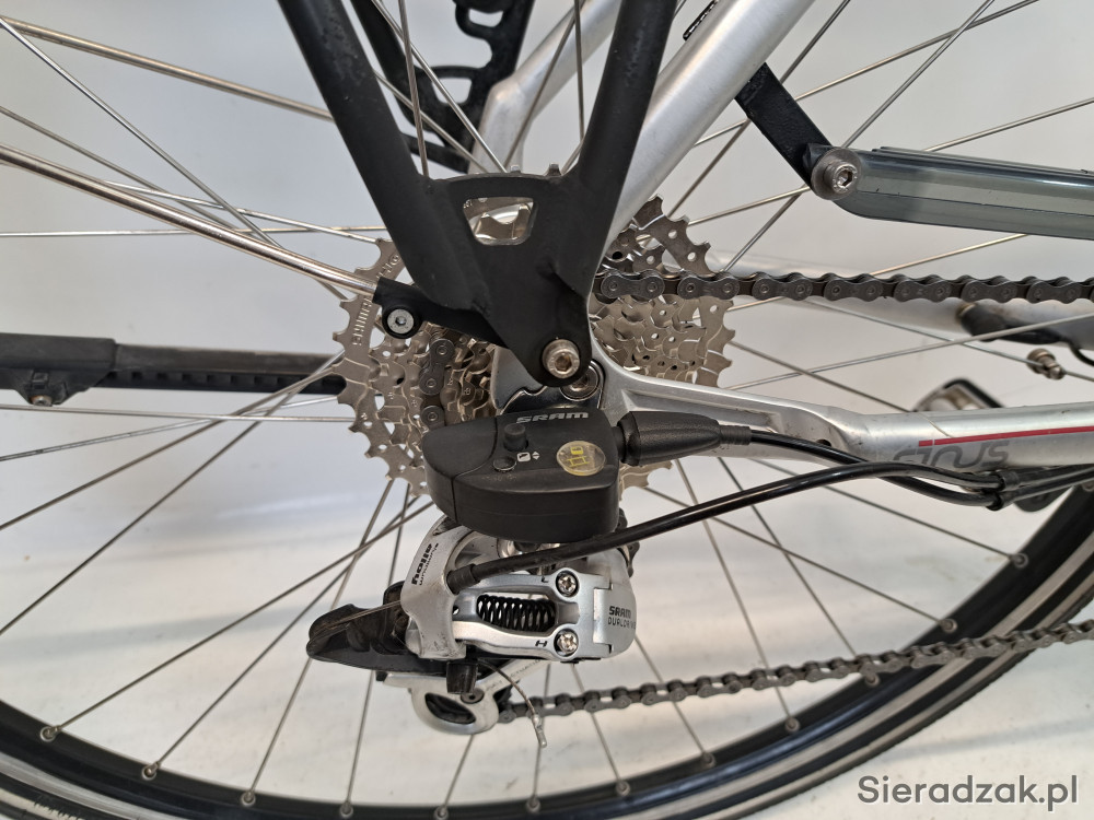 rama aluminium 22" 56cm (XL),przerzutka planetarna sram dual drive 3 biegi w piaście + napęd 9-rzędowy,hamulce v-brake shimano,manetki sram dual drive,oświetlenie lumotec zasilane z dynama shimano w przednim kole,siodełko selle royal z amortyzowaną sztycą podsiodłową,zabezpieczenie tylnego koła abus,amortyzator sr suntour nex 4110.stan techniczny bardzo dobry,wizualnie niewielkie ślady użytkowania.