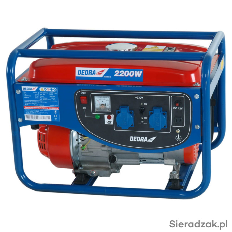 Agregat prądotwórczy 2200W firmy DEDRA. Agregat wytwarza prąd o napięciu 230V (2 gniazda).
