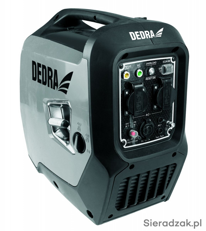 Agregat prądotwórczy DEGA2000 Dedra jest wyposażony w 2 gniazda 230V i 1 gniazdo 12V. Sinusoidalny przebieg napięcia wyjściowego sprawia, że generator może pracować z wszystkimi urządzeniami sieciowymi do mocy 1800W. Urządzenie posiada zabezpieczenie przed niskim poziomem oleju oraz zabezpieczenie przeciążeniowe. Jest też wyposażony w czytelny panel sterowania. Uchwyt zapewnia wygodne przenoszenie agregatu.