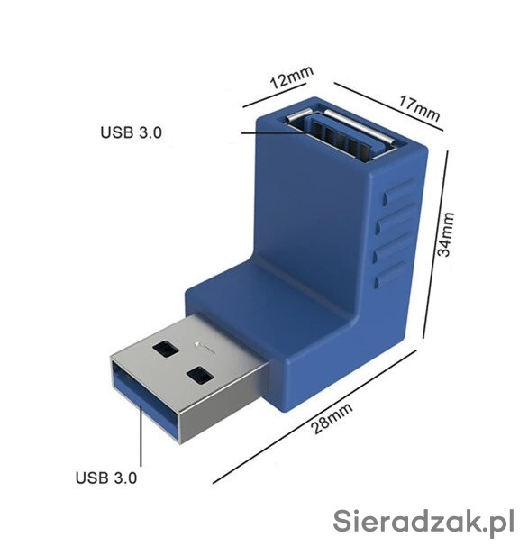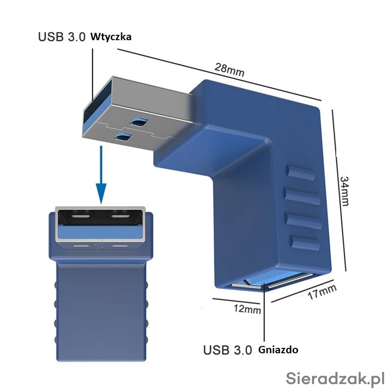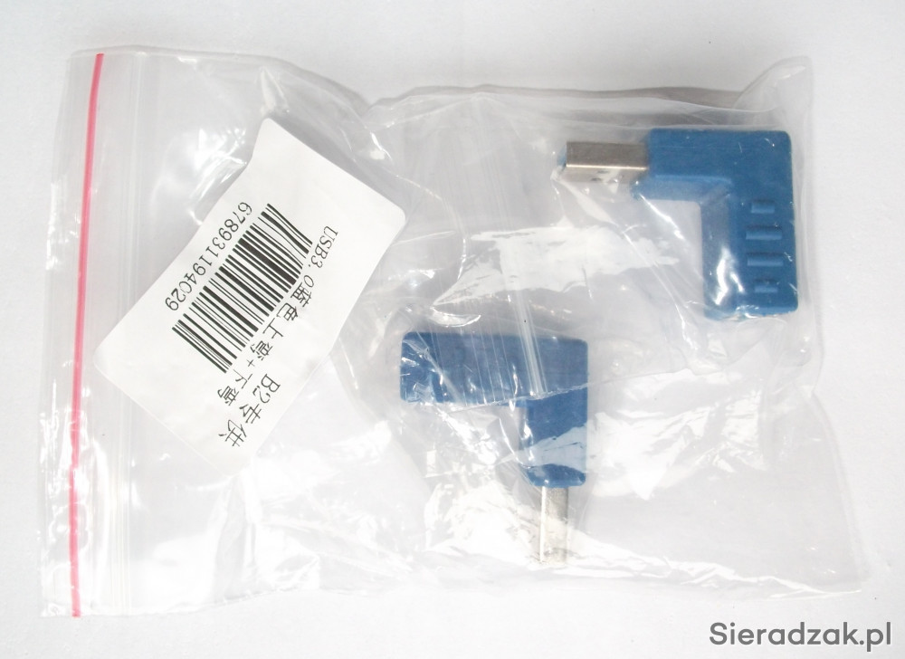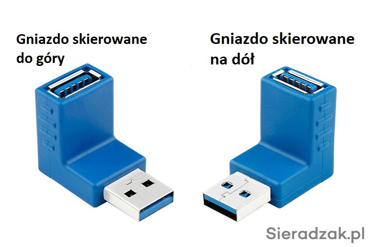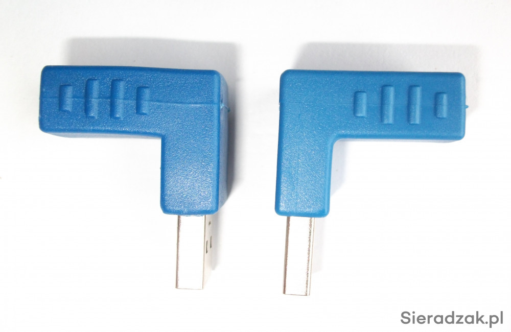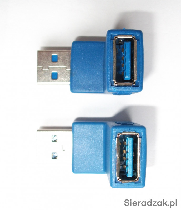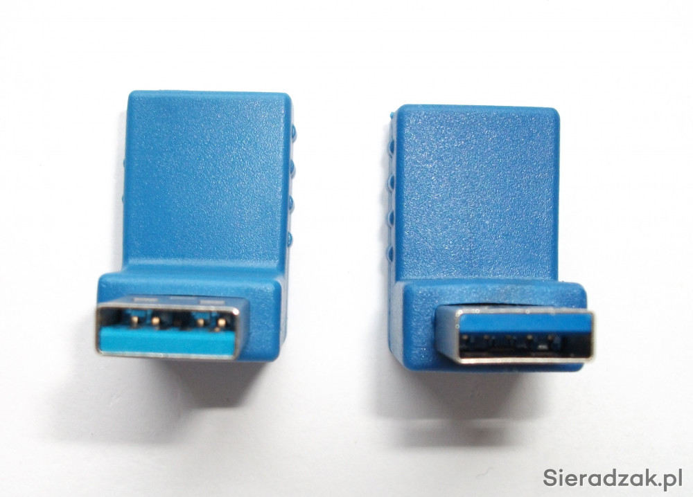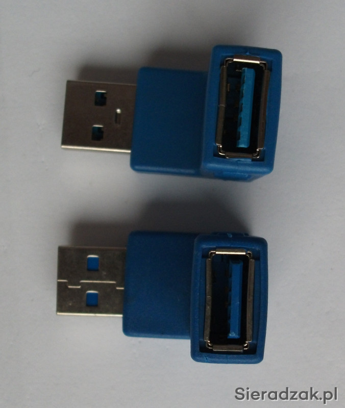 Sprzedam komplet dwóch złączek kątowych 90 stopni USB 3.0. Jedna złączka po podłączeniu do komputera (laptopa) ma gniazdo skierowane ku górze, a druga ku dołowi.