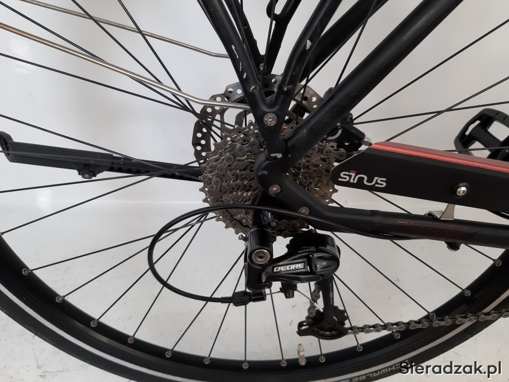 rama aluminium 21" 54cm,napęd 9-rzędowy shimano deore,manetka shimano deore,hamulce hydrauliczne shimano,amortyzator sr suntour,oświetlenie zasilane z akumulatora,lampa tylna wbudowana w bagażnik,siodełko volare,opony schwalbe.stan techniczny bardzo dobry,wizualnie ślady normalnego użytkowania.