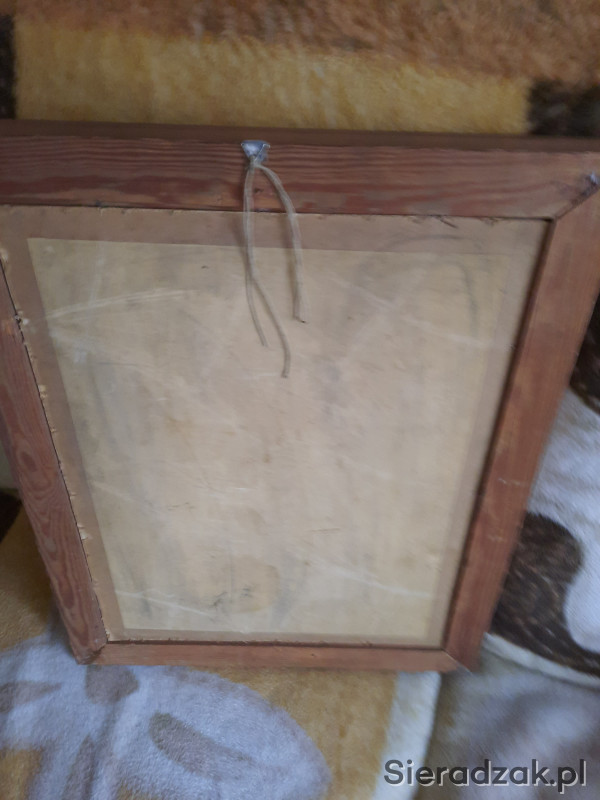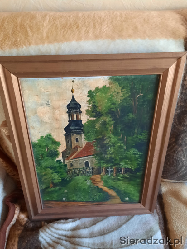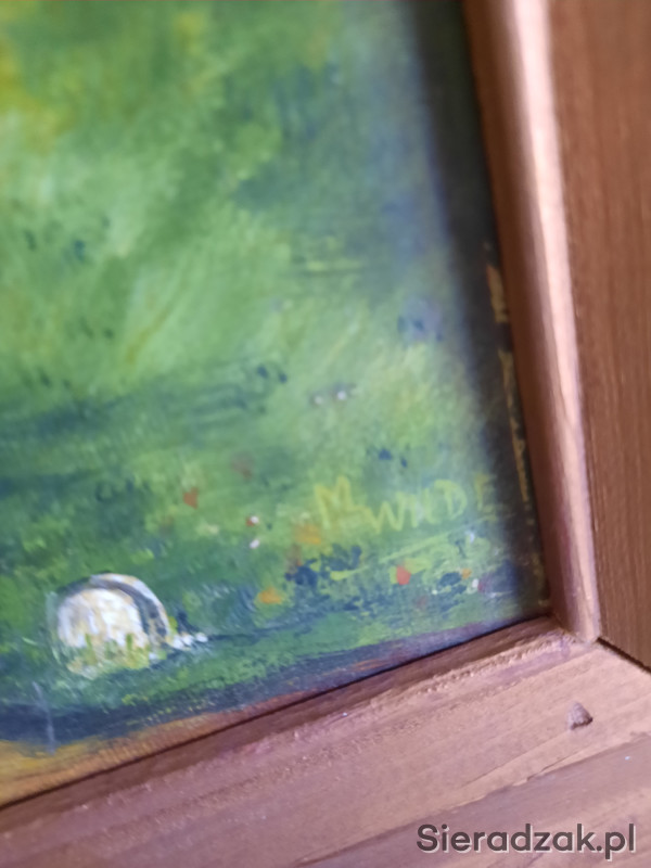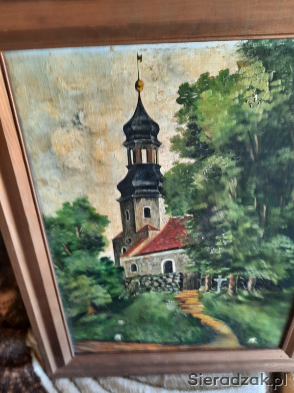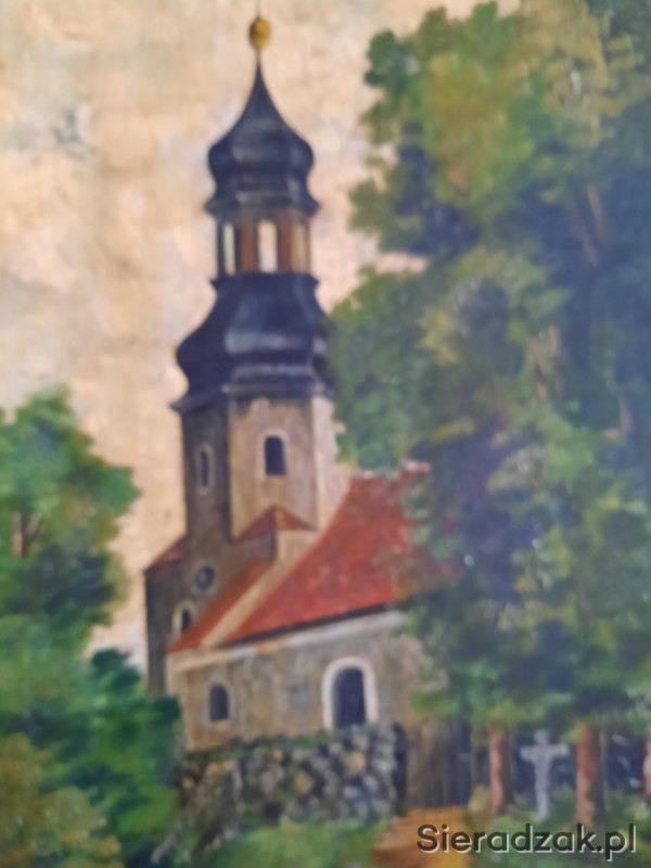 Kościół - okolice Wielunia ? Olej na tekturze. Brązowa, drewniana rama.Sygnowany - M.WHDE 1936 ? Wymiary 48 x 59 cm. Stan bardzo dobry.