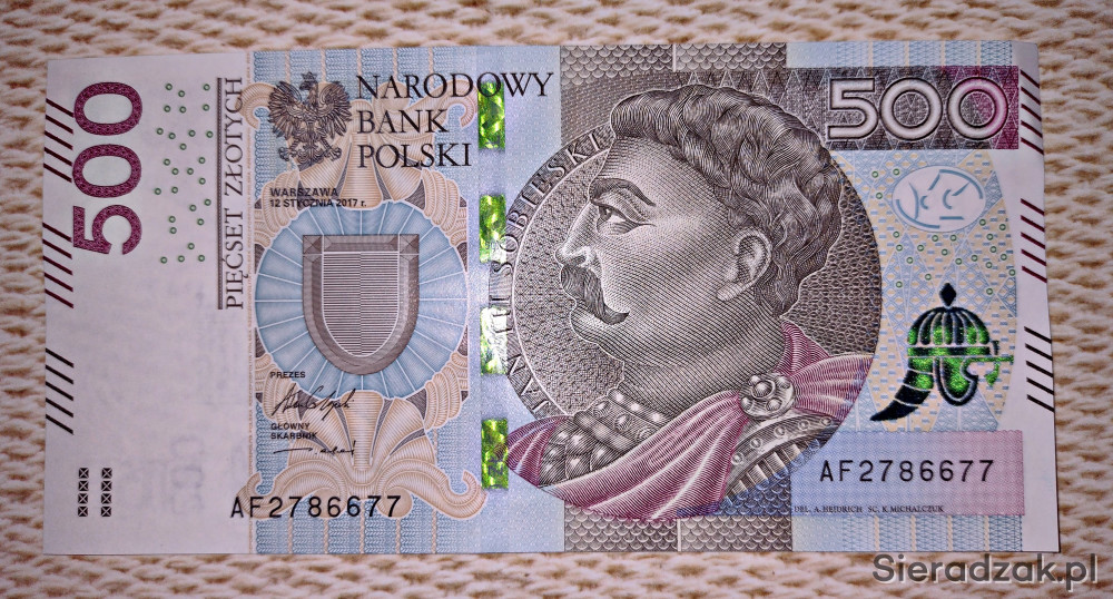 Banknot bankowy obiegowy o nominale 500 złotych, wyemitowany w 2017 roku.