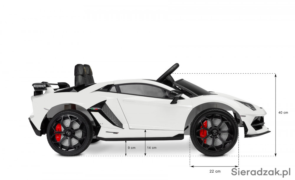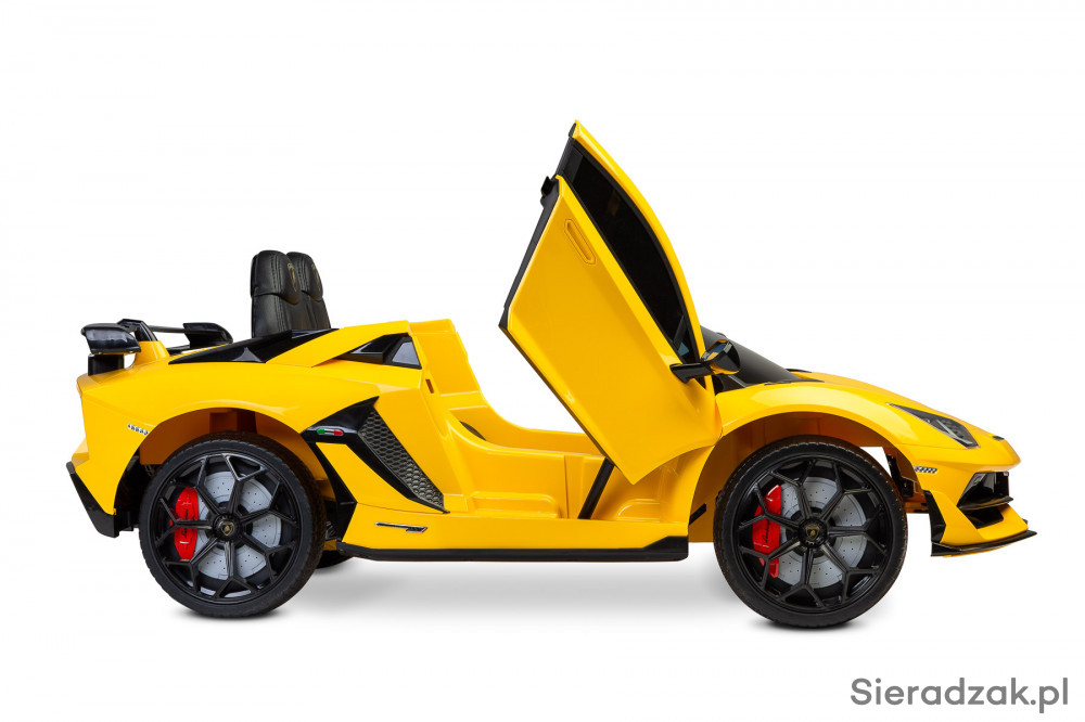 Pojazd na akumulator Lamborghini jest licencyjną wersją niezwykłego supersamochodu, który dostarczy najmłodszym niezapomnianych przeżyć. Dynamiczna linia nadwozia, charakterystyczne światła oraz otwierane do góry drzwi to tylko kilka elementów, które oddają wyjątkowość Lamborghini. Wnętrze zostało wykonane z dbałością o detale. Fotel z wysokiej jakości ekoskóry zwieńcza złote logo kultowej marki, a na kierownicy znajdują się przyciski klaksonu i przełączania melodii. Dodatkowo z tyłu kryje się schowek na zabawki.