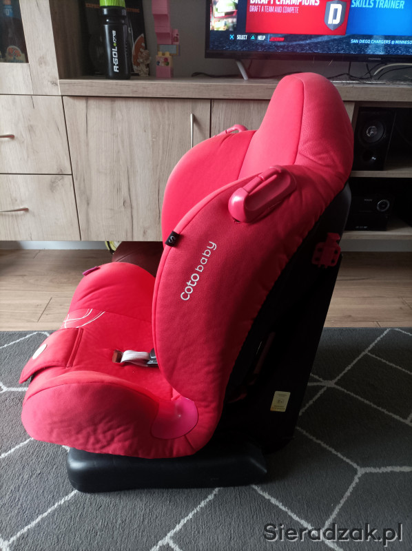 Fotelik samochodowy coto baby - używany, w dobrym stanie, bok lekko wyblakły od słońca. Fotelik od 9-25kg, regulowany. Fotelik jest poszerzony o możliwość montażu za pomocą systemu ISOFIX. Zapewnia bezpieczeństwo małego pasażera od 9 miesiąca życia do 6 lat. Posiada 5 stopniową regulację kąta nachylenia, co sprawia, że nawet najdłuższe podróże stają się komfortowe. Fotelik polecany szczególnie z uwagi na dodatkowy zagłówek oraz prowadnice pasów, chroniącą miednicę dziecka. Cechy:
