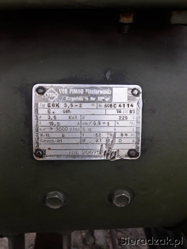 Witam sprzedam agregat prądotwórczy renomowanej niemieckiej firmyVEB FILMAG FINSTERWALDO.Agregat jest trójfazowy o mocy 3,5kw silnik dwusuwowy o mocy 6km Więcej informacji udzielę pod numerem tel. niektóre dane na tabliczkach