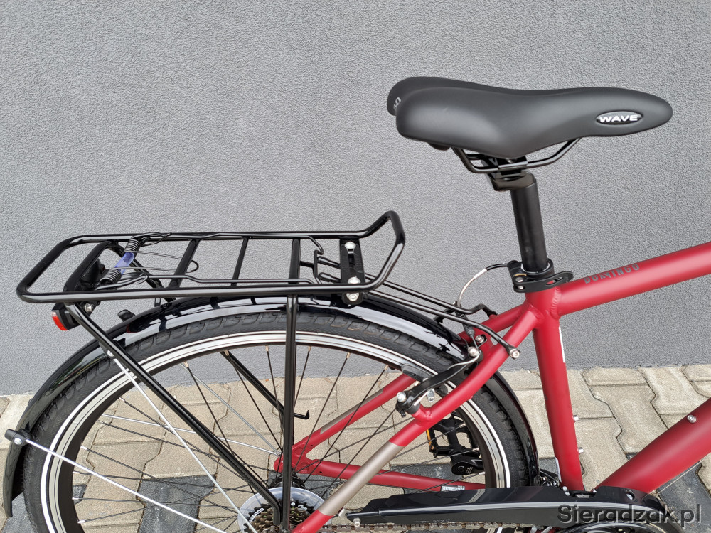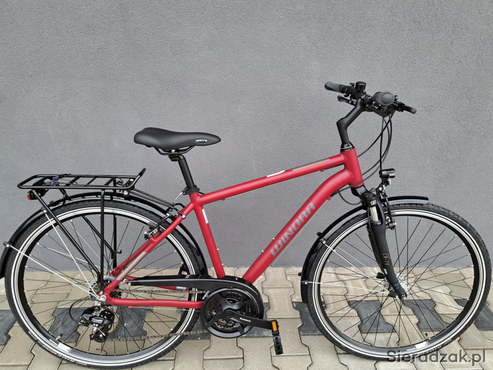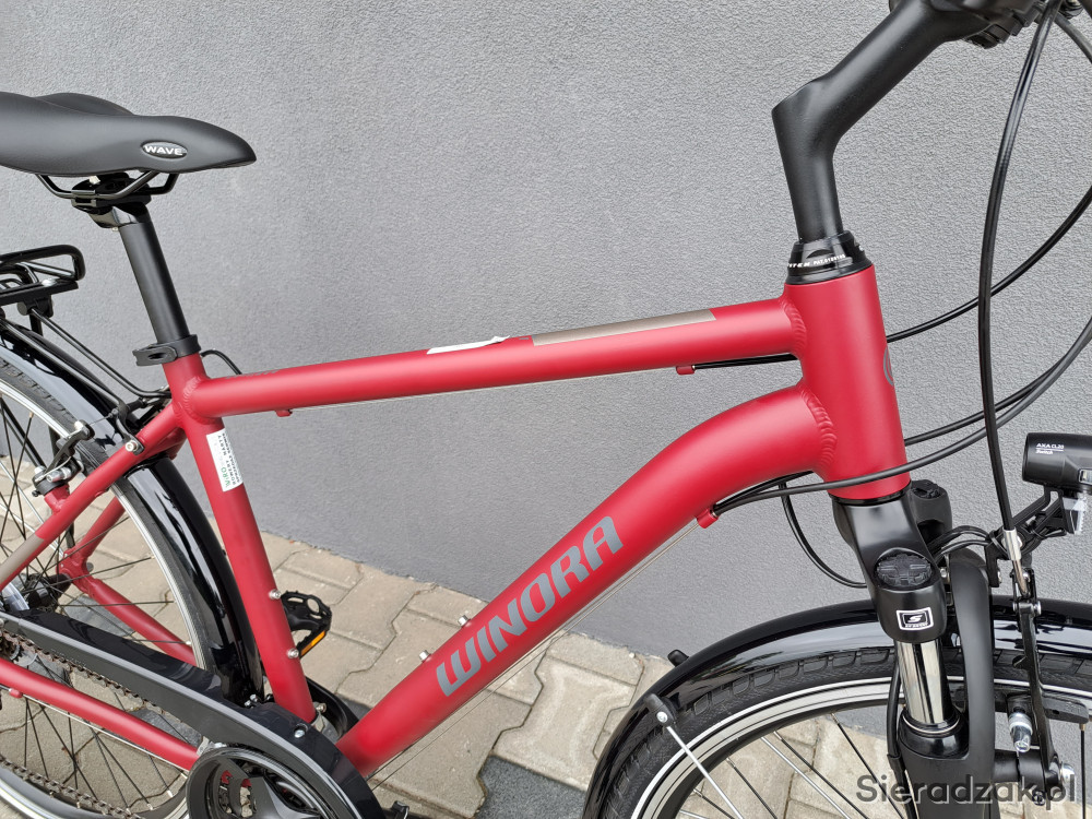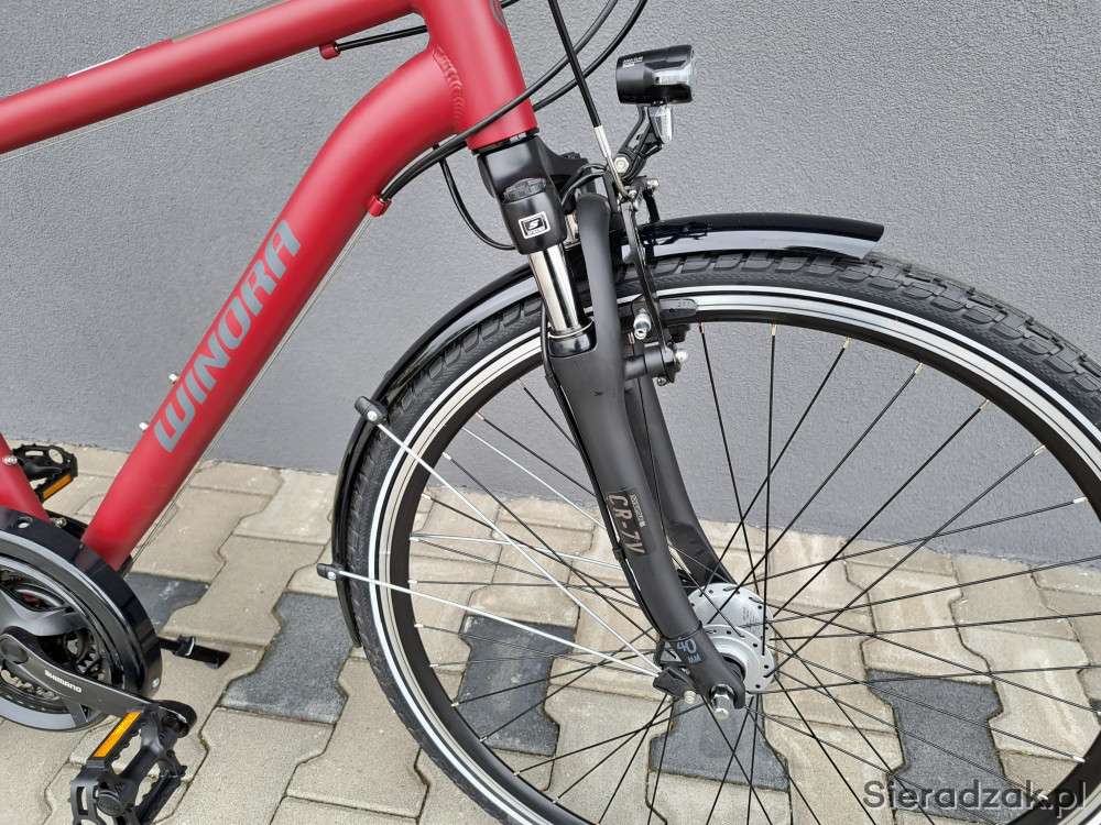 rama aluminium 18" 47cm,napęd 3x7,przerzutki shimano tourney,klamkomanetki shimano,hamulce v-brake shimano,oświetlenie led axa,dynamo shimano w przednim kole,siodło selle royal wave,amortyzator sr suntour cr 7v,opony continental ride tour.