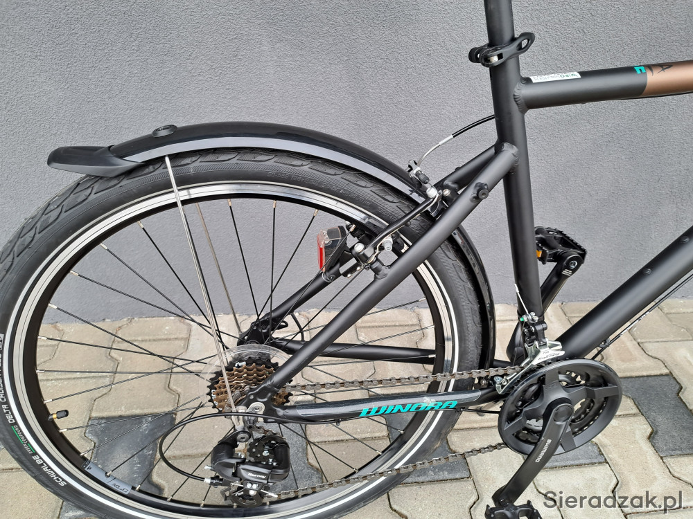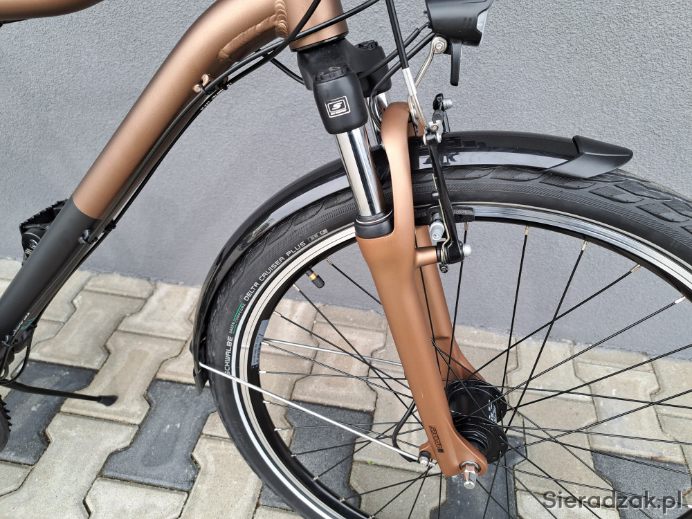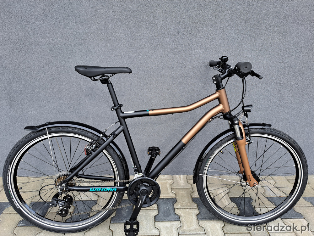 rama aluminium 6061 19" 49cm,napęd 3x7,przerzutki shimano tourney,klamkomanetki shimano,hamulce v-brake shimano,dynamo shimano nexus,oświetlenie led axa,opony schwalbe delta cruiser plus,amortyzaor sr suntour m3010.