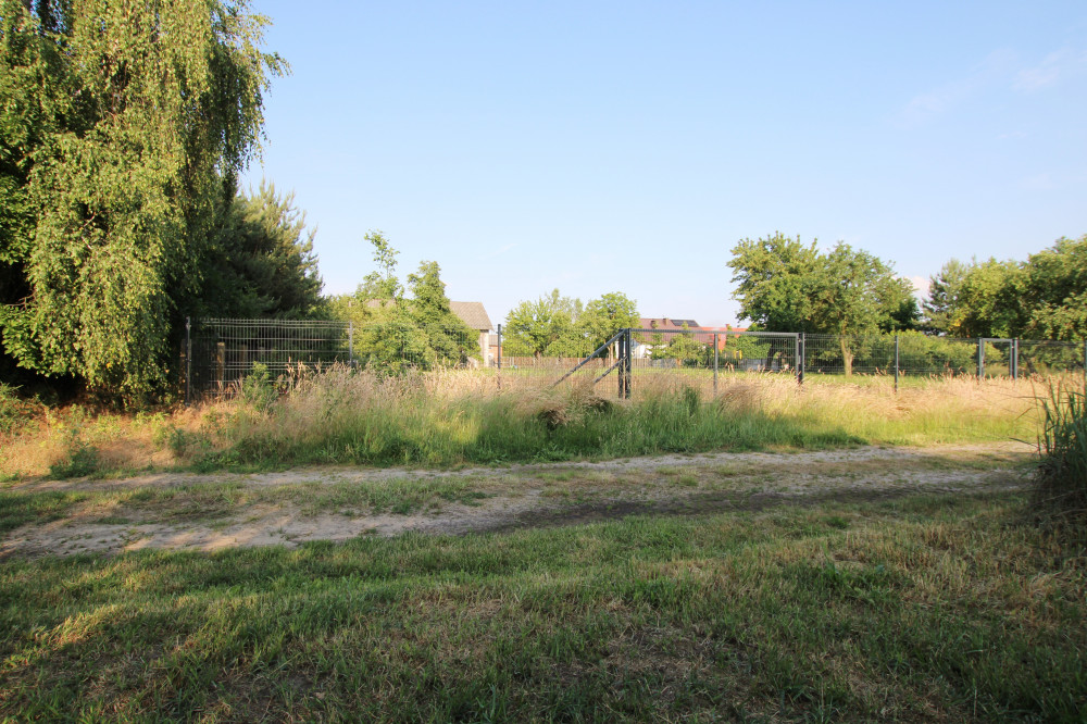 Działka całkowicie ogrodzona siatką oraz bramą przesuwną i furtką.