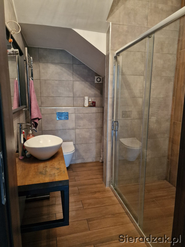 Poddasze: 3 sypialnie, garderoba na korytarzu, łazienka z prysznicem i wanną.