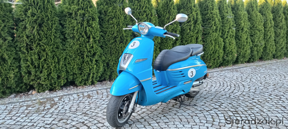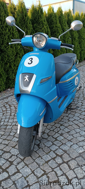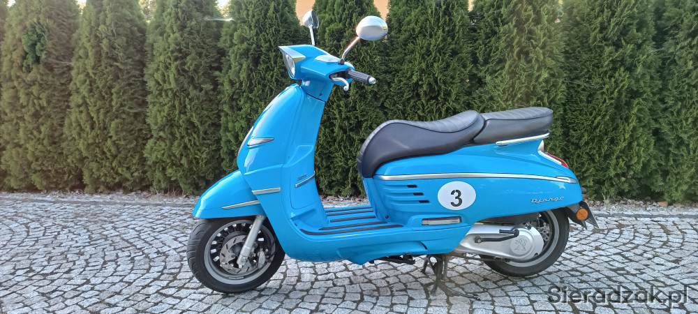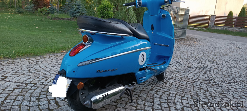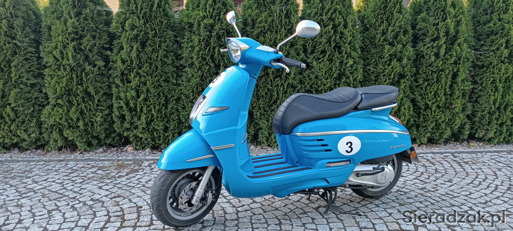 Sprzedam swojego prywatnego Peugeota Django 125. Śliczny przykuwający wzrok błękitny kolor. Wpada w oko. Skuter zarejestrowany i ubezpieczony. Beż żadnych mankamentów technicznych. Po zakupie można śmiało pojechać na kołach do domu. Prowadzi się bardzo dobrze. Średnie spalanie ok. 3l. 2 kluczyki, książka serwisowa. Polecam, na żywo wygląda jeszcze lepiej. Zapraszam do oględzin. Więcej informacji pod nr tel. 605130170 - . Posiadam również oryginalny zimowy pokrowiec na nogi oczywiście marki Peugeot.