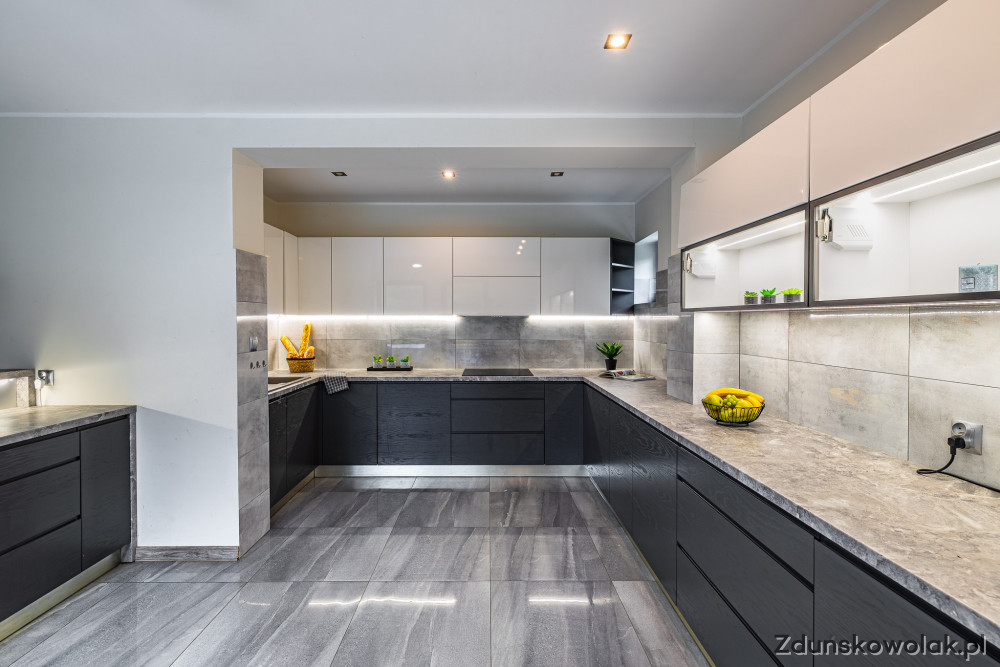 Przy jadalni mamy otwartą, widną kuchnię w nowoczesnej kolorystyce z pełnym wyposażeniem AGD (lodówka, zmywarka oraz piekarnik w zabudowie, płyta indukcyjna).