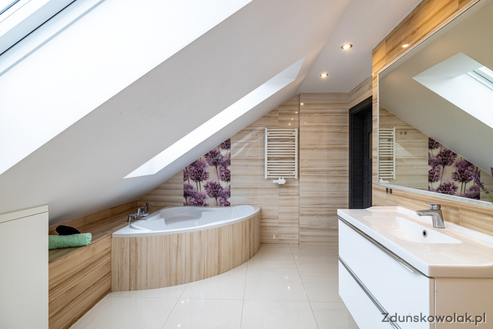 Poddasze wyposażone jest w jasną łazienkę z narożną wanną, umywalką oraz ubikacją - całość w beżowym, neutralnym kolorze.