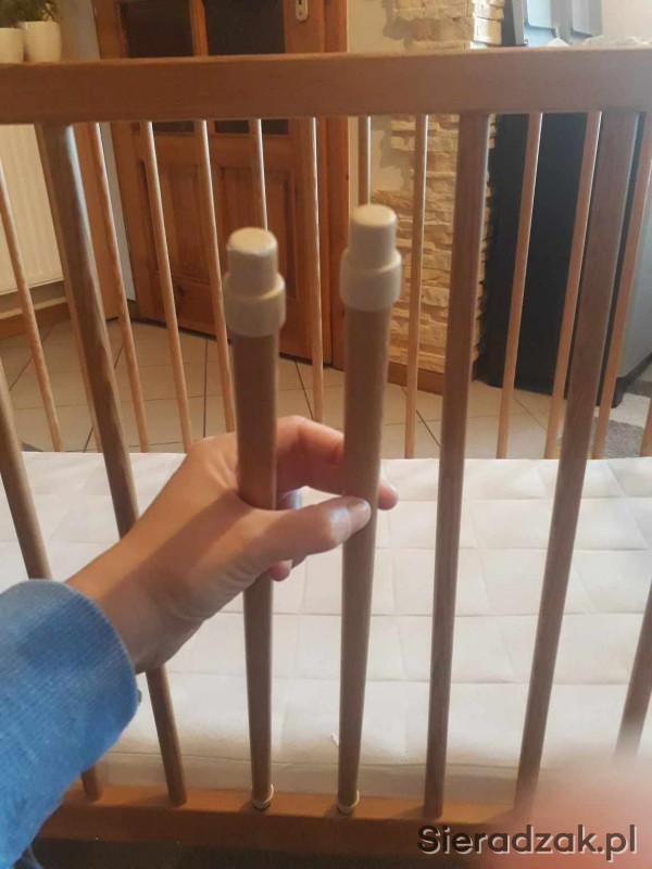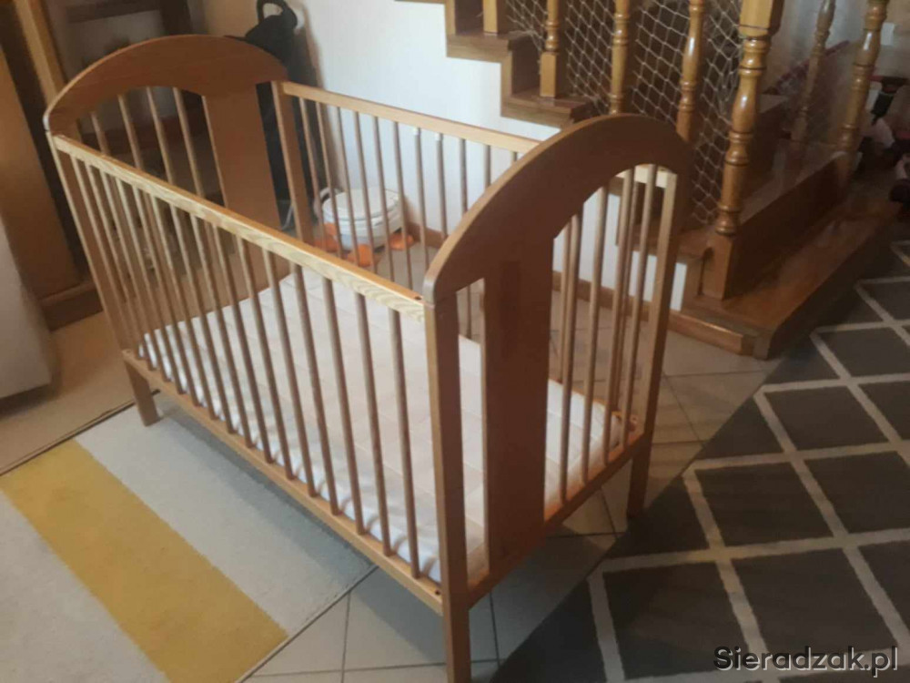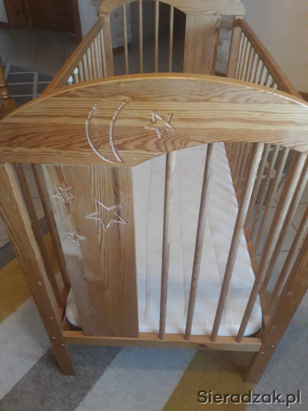 Do sprzedania łóżeczko (materac gratis), wymiary 60 /120 cm. Możliwość ustawienia wysokości materaca. Łóżeczko posiada na obu bokach ładne zdobienia - księżyc i gwiazdki. Ma wyjmowalne 2 szczebelki, które można usunąć sterszemu juz dziecku, by samodzielnie wychodziło z łóżeczka. Materac bardzo dobrej jakości z wkładem kokosowo-gryczanym, zdejmowalny pokrowiec na zamek. Mimo ochrony specjalną matą, i tak pojawiły sie plamy - były od razu zapierane.