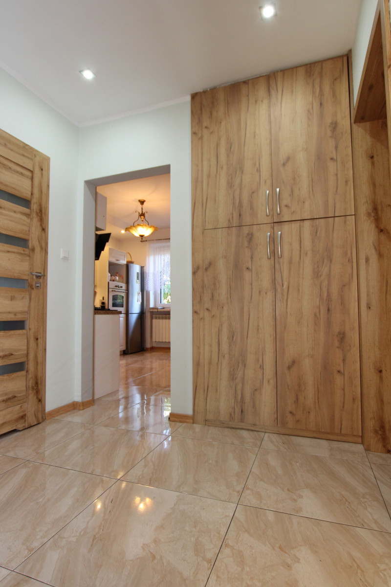 Wnętrze budynku utrzymane w stanie bardzo dobrym - na podłodze znajduje się terakota, panele, deska sosnowa lakierowana, ściany w gładzi gipsowej i zabudowie G/K, pomalowane.