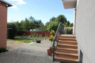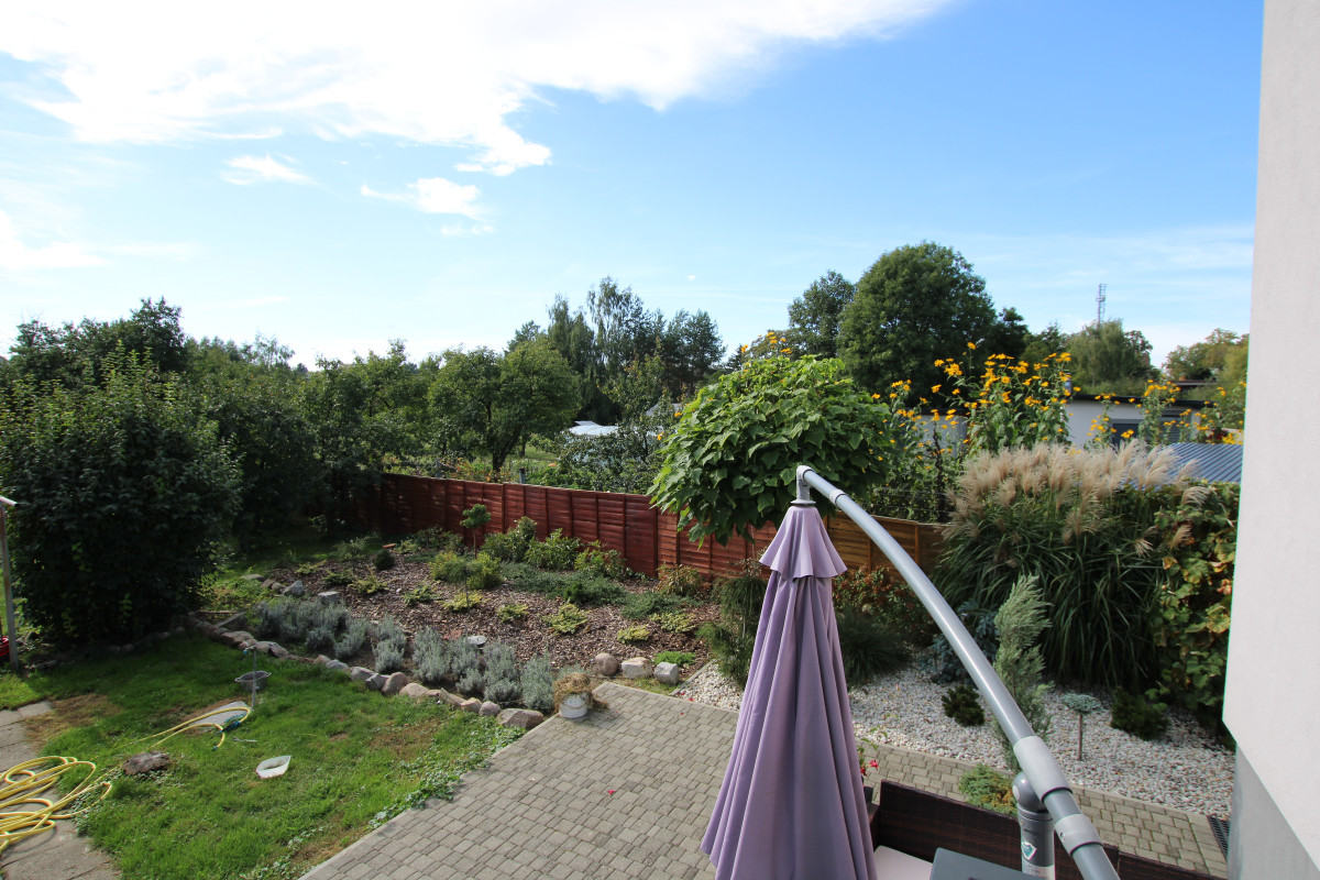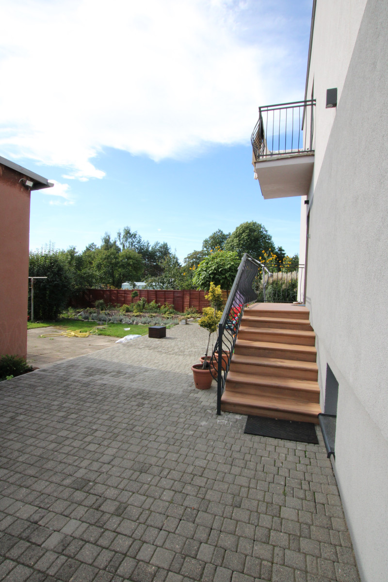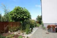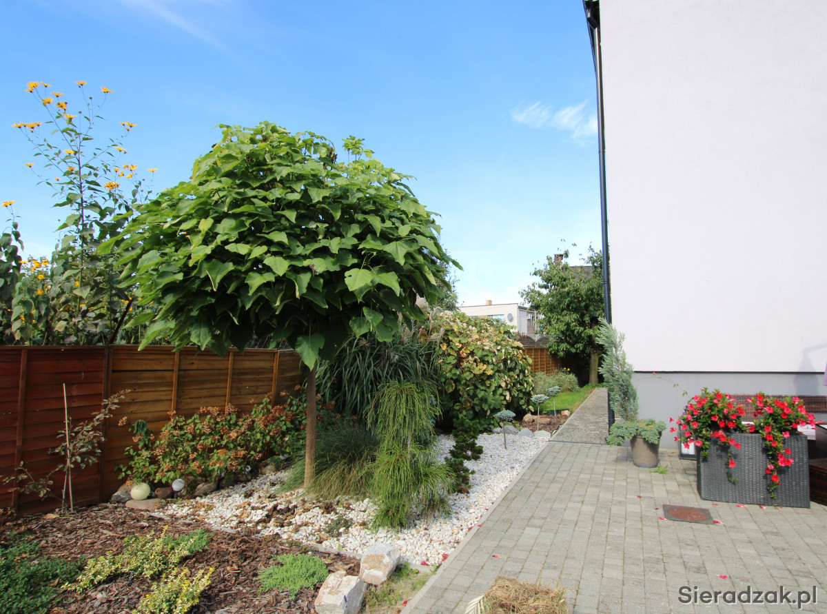 Podwórko zagospodarowane kostką dookoła budynku, liczne nasadzenia wieloletnie drzew i krzewów ozdobnych, w dwóch miejscach na działce wyprowadzone przyłącze wody do użytku w ogrodzie, altana w tylnej zacisznej części podwórka.