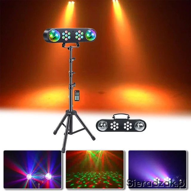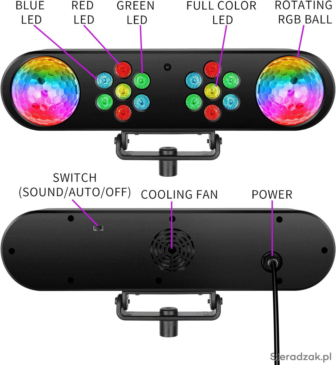 Połączenie 2-efektów w jednej obudowie Led Par x 2 + disco kula x 2 na statywie. Dzięki temu posiada duże możliwości pracy w każdych warunkach. Każdy użytkownik będzie z pewnością zadowolony mając możliwość użycia wszystkich efektów na każdej imprezie.