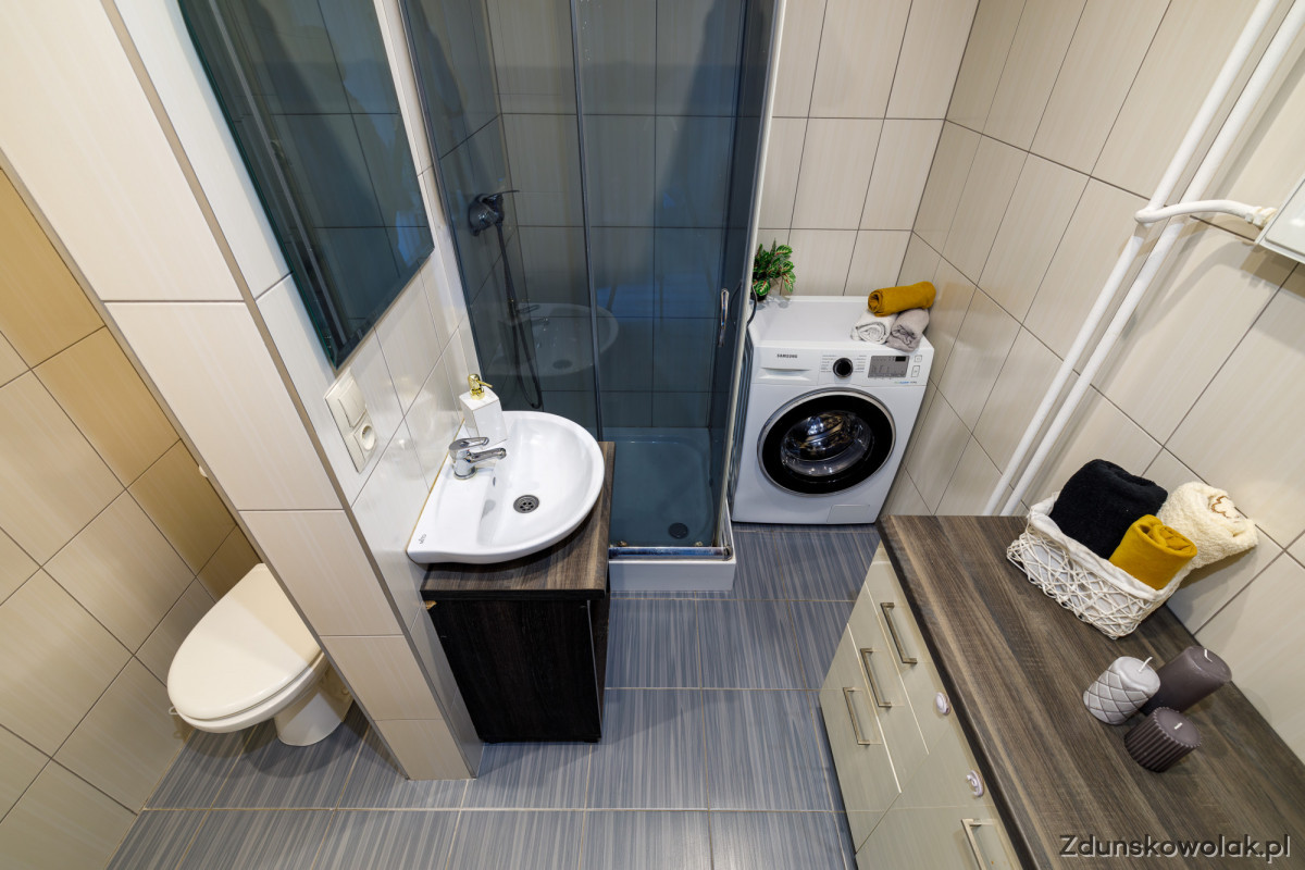 Łazienka (4 mkw) mieści prysznic, nowoczesną szafkę z umywalką nablatową, automat do prania. Aby zapewnić prywatność, łazienka posiada oddzieloną przestrzeń na WC. Białe płytki na ścianie optycznie powiększają pomieszczenie, a drewniane blaty na szafkach dodają jej charakteru.