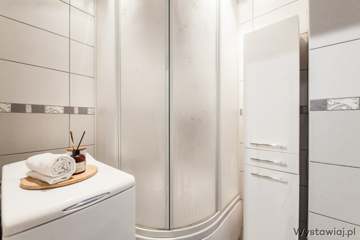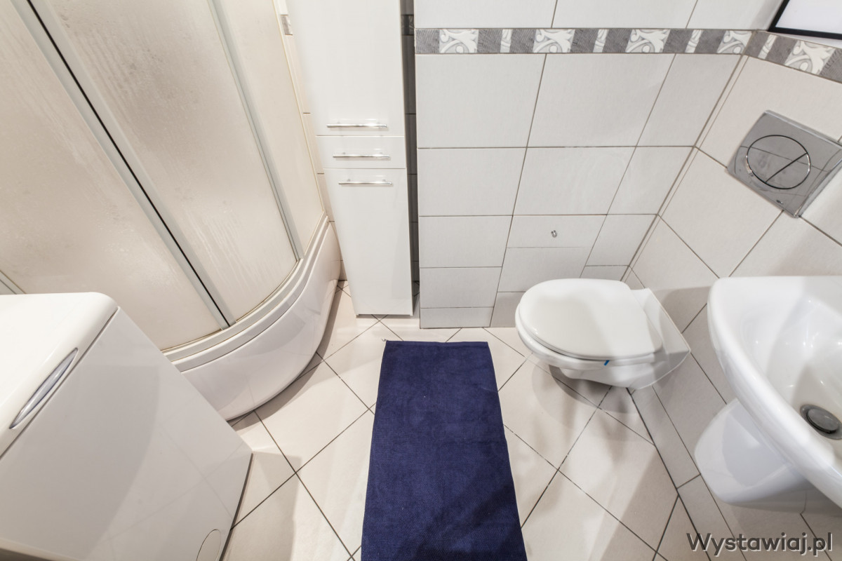 Łazienka - zmieścimy w niej wszystko, co w łazience mieścić się powinno. Znajdziemy w niej obecnie pralkę, prysznic, umywalkę i WC.