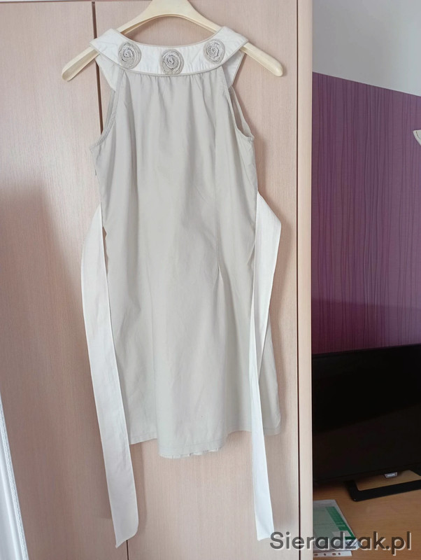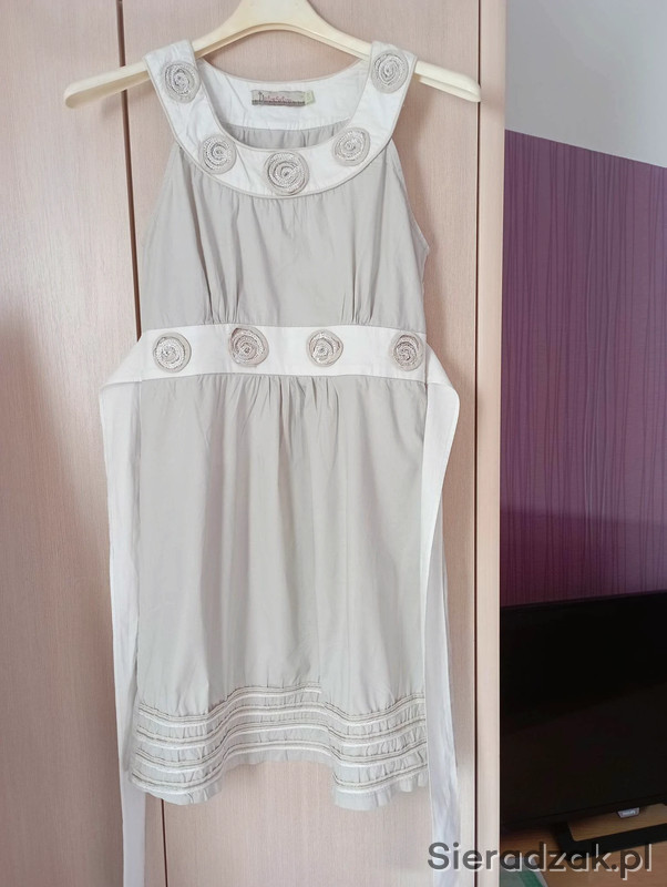 Marka-Sophyline ,Rozmiar-S/M , Kolor-jasno beżowy, Bawełna 97%, elastan 3%, Sukienka na szerokich ramiączkach, w pasie ozdobny pasek, pod pachami 43cmx2, w pasie 38cmx2, długość 83cm . Stan-bardzo dobry